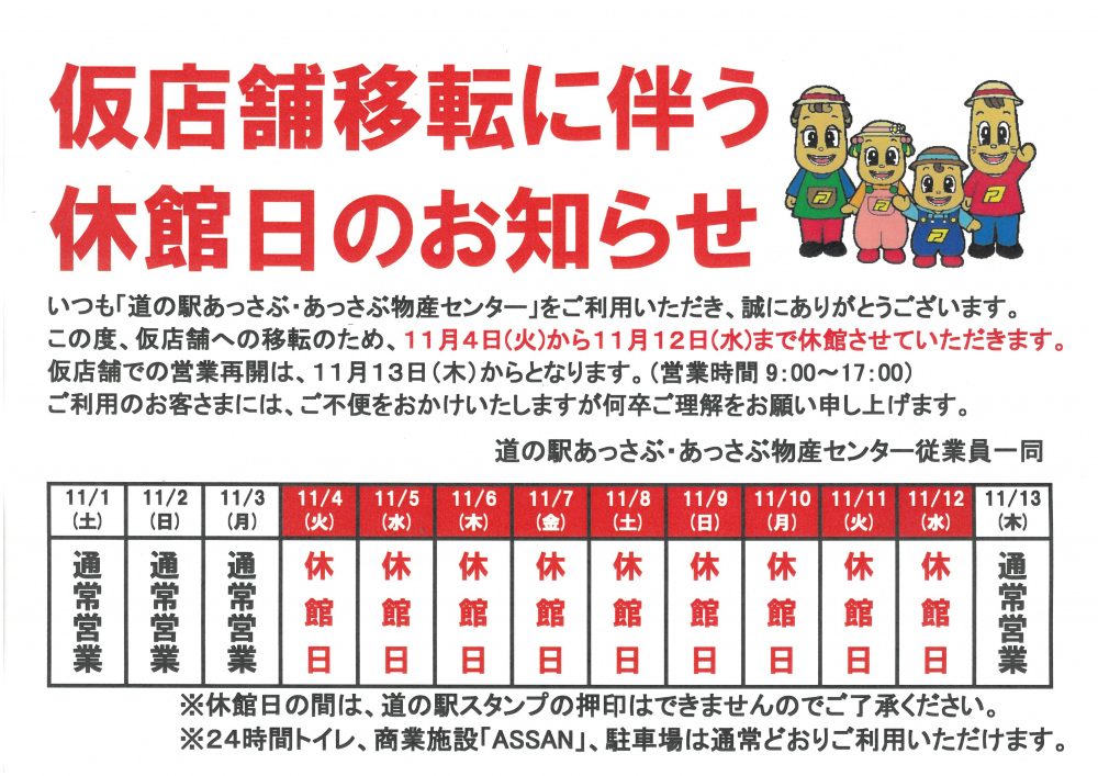 いつも「道の駅あっさぶ・あっさぶ物産センター」をご利用いただき、誠にありがとうございます。